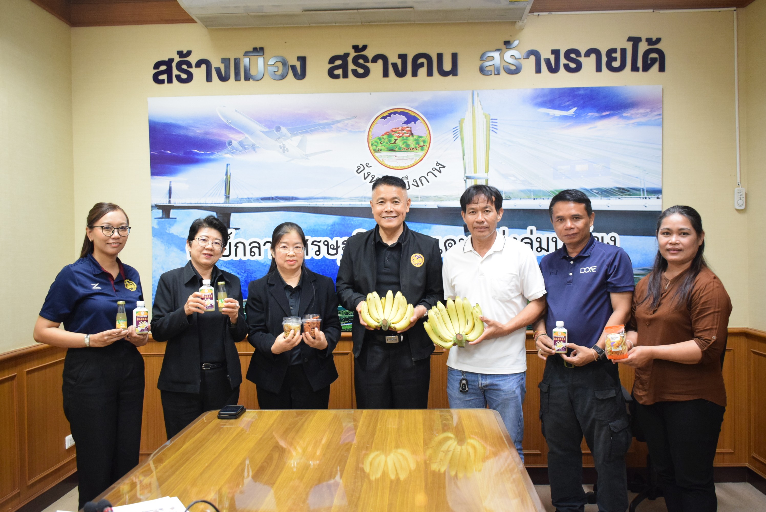 นางสาวสุภาภรณ์ วิไลเรืองสุวรรณ อุตสาหกรรมจังหวัดบึงกาฬ เข้าร่วมแลกเปลี่ยนข้อเสนอแนะแนวทางการยกระดับมาตรฐานสินค้าให้แก่กลุ่มแปลงใหญ่กล้วยหอมทอง BK 77 นำโดยคุณคมสันต์ กลางโชคชัย เพื่อพัฒนาคุณภาพผลิตภัณฑ์ การออกแบบบรรจุภัณฑ์ การขอรับรองมาตรฐานที่เกี่ยวข้อง การสร้างอัตลักษณ์แบรนด์ ตลอดจนการขยายช่องทางการตลาดทั้งในและต่างจังหวัด อันจะช่วยเพิ่มขีดความสามารถทางการแข่งขันและสร้างรายได้ที่มั่นคงให้กับเกษตรกรในพื้นที่อย่างยั่งยืน ณ ห้องประชุมหลวงพ่อพระใหญ่ ชั้น 2 ศาลากลางจังหวัดบึงกาฬ โดยมีนายสมหวัง อารีย์เอื้อ รองผู้ว่าราชการจังหวัดบึงกาฬ เป็นประธานการประชุมฯ